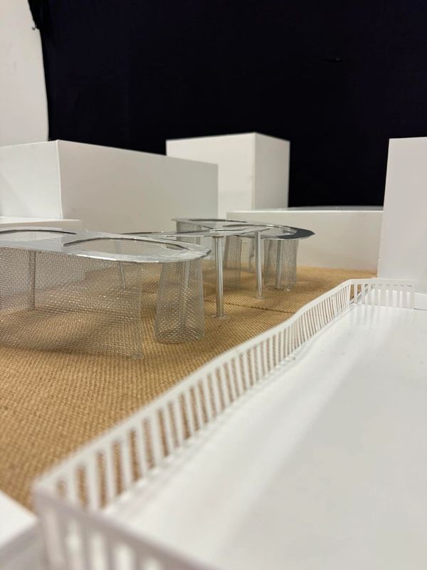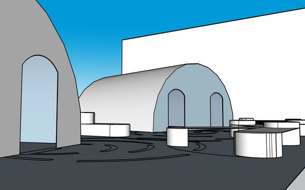 Early model; perspective view, highlighting angled shelter roofs and shelter height.
